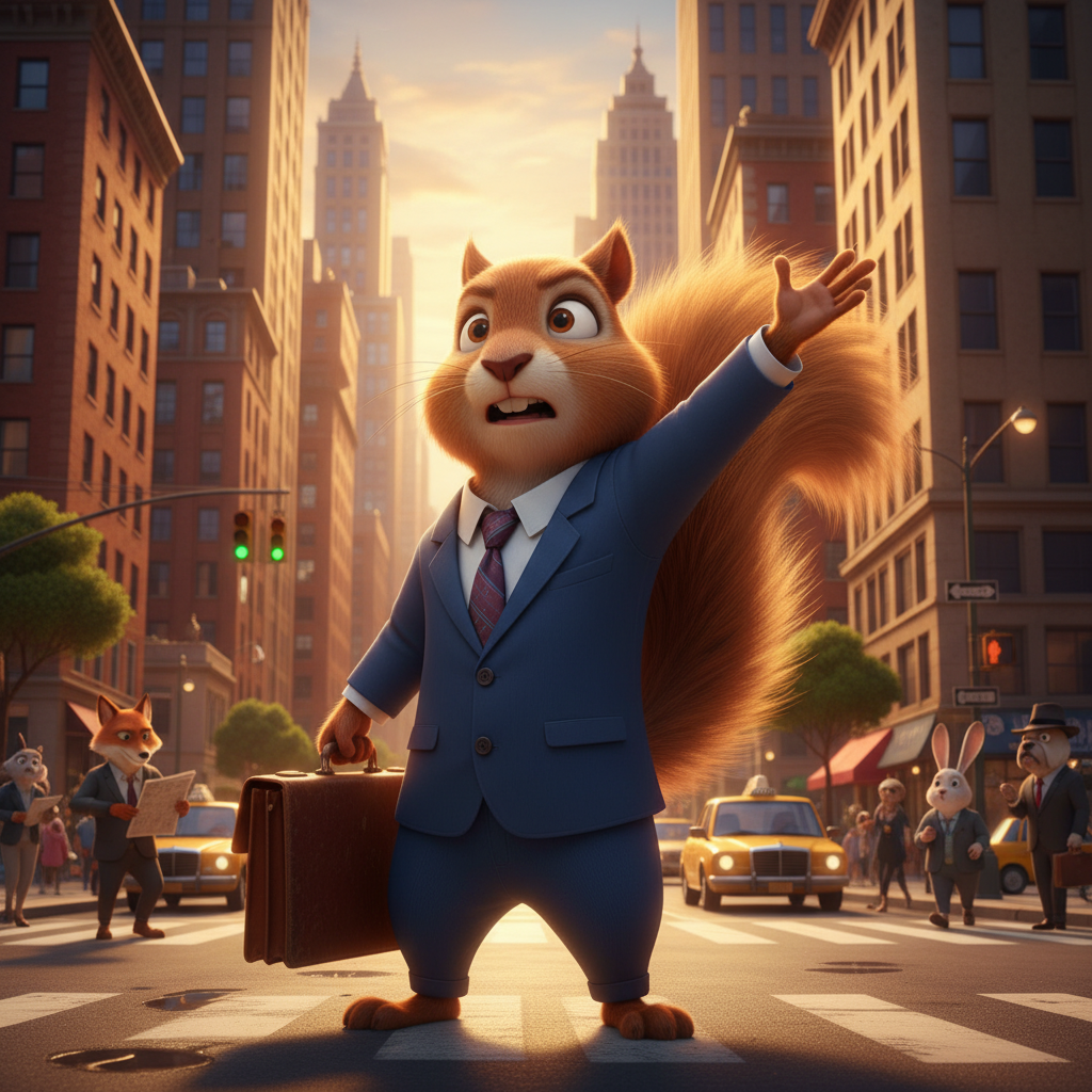 Text to Image Prompt: “make me a squirrel in a blue business suit in a pixar style animation character holding a briefcase hailing a taxi from the corner of a busy city street”